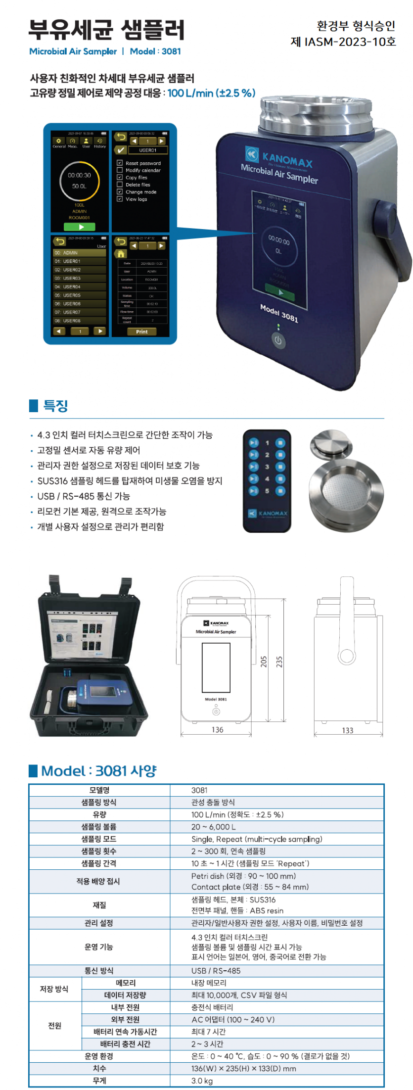 사용자 친화적인 차세대 부유세균 샘플러(에어샘플러). 고유량 정밀 제어로 제약 공정 대응 : 100L/min